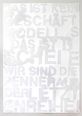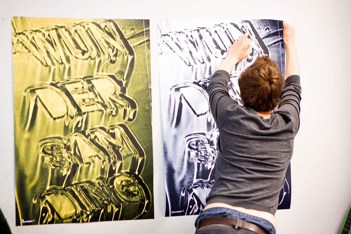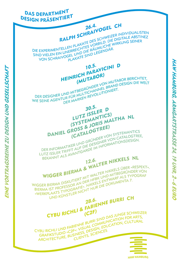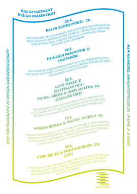 Plakatworkshops: In Anlehnung an die Arbeitsphilosophien der Referenten entwicklen Studierende inhaltliche und formale Themen für das Gestalten assoziativer Plakate. Die Workshops sind ein analoges Entwurfstraining, bei dem sich Schrift und Bilder als freie Gestaltungselemente entwicklen dürfen.